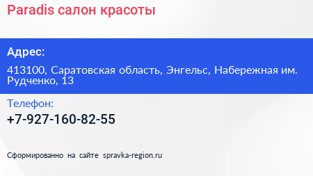 Paradis, салон красоты по адресу 413100, Саратовская область, Энгельс, Набережная им. Рудченко, 13 в дальнейшем Организация, размещена в следующих категориях: