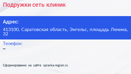 Подружки, сеть клиник по адресу 413100, Саратовская область, Энгельс, площадь Ленина, 32 в дальнейшем Организация, размещена в следующих категориях: