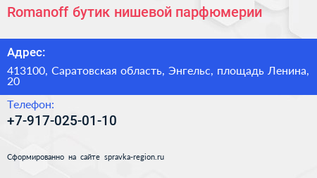 Romanoff, бутик нишевой парфюмерии по адресу 413100, Саратовская область, Энгельс, площадь Ленина, 20 в дальнейшем Организация, размещена в следующих категориях: