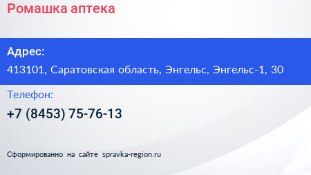Ромашка, аптека по адресу 413101, Саратовская область, Энгельс, Энгельс-1, 30 в дальнейшем Организация, размещена в следующих категориях: