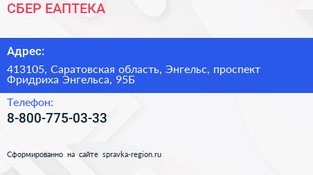 СБЕР ЕАПТЕКА по адресу 413105, Саратовская область, Энгельс, проспект Фридриха Энгельса, 95Б в дальнейшем Организация, размещена в следующих категориях: