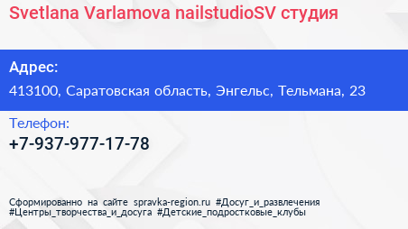 Svetlana Varlamova nailstudioSV, студия по адресу 413100, Саратовская область, Энгельс, Тельмана, 23 в дальнейшем Организация, размещена в следующих категориях:
