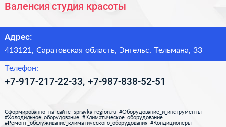 Валенсия, студия красоты по адресу 413121, Саратовская область, Энгельс, Тельмана, 33 в дальнейшем Организация, размещена в следующих категориях: