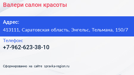 Валери, салон красоты по адресу 413111, Саратовская область, Энгельс, Тельмана, 150/7 в дальнейшем Организация, размещена в следующих категориях: