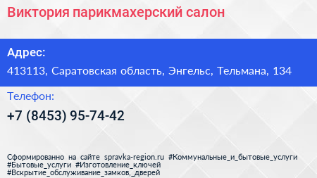 Виктория, парикмахерский салон по адресу 413113, Саратовская область, Энгельс, Тельмана, 134 в дальнейшем Организация, размещена в следующих категориях: