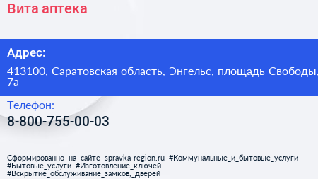 Вита, аптека по адресу 413100, Саратовская область, Энгельс, площадь Свободы, 7а в дальнейшем Организация, размещена в следующих категориях: