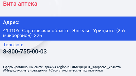 Вита, аптека по адресу 413105, Саратовская область, Энгельс, Урицкого (2-й микрорайон), 22Б в дальнейшем Организация, размещена в следующих категориях: