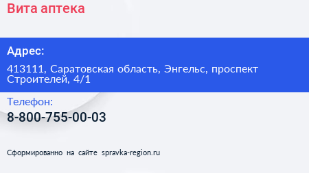 Вита, аптека по адресу 413111, Саратовская область, Энгельс, проспект Строителей, 4/1 в дальнейшем Организация, размещена в следующих категориях: