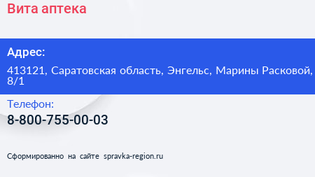 Вита, аптека по адресу 413121, Саратовская область, Энгельс, Марины Расковой, 8/1 в дальнейшем Организация, размещена в следующих категориях: