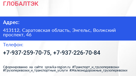 ГЛОБАЛТЭК по адресу 413112, Саратовская область, Энгельс, Волжский проспект, 46 в дальнейшем Организация, размещена в следующих категориях: