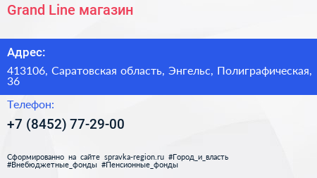 Grand Line, магазин по адресу 413106, Саратовская область, Энгельс, Полиграфическая, 36 в дальнейшем Организация, размещена в следующих категориях: