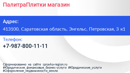 ПалитраПлитки, магазин по адресу 413100, Саратовская область, Энгельс, Петровская, 3 к1 в дальнейшем Организация, размещена в следующих категориях: