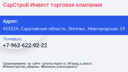 СарСтрой-Инвест, торговая компания по адресу 413114, Саратовская область, Энгельс, Новгородская, 19 в дальнейшем Организация, размещена в следующих категориях: