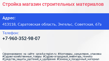 Стройка, магазин строительных материалов по адресу 413118, Саратовская область, Энгельс, Советская, 67а в дальнейшем Организация, размещена в следующих категориях: