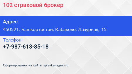 102, страховой брокер по адресу 450521, Башкортостан, Кабаково, Лазурная, 15 в дальнейшем Организация, размещена в следующих категориях: