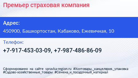 Премьер, страховая компания по адресу 450900, Башкортостан, Кабаково, Ежевичная, 10 в дальнейшем Организация, размещена в следующих категориях: