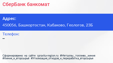 СберБанк, банкомат по адресу 450056, Башкортостан, Кабаково, Геологов, 23Б в дальнейшем Организация, размещена в следующих категориях: