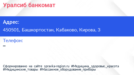 Уралсиб, банкомат по адресу 450501, Башкортостан, Кабаково, Кирова, 3 в дальнейшем Организация, размещена в следующих категориях: