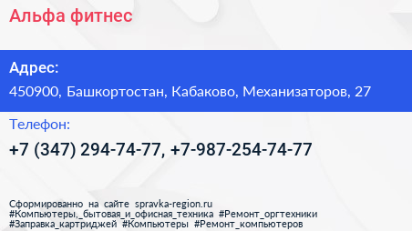Альфа-фитнес по адресу 450900, Башкортостан, Кабаково, Механизаторов, 27 в дальнейшем Организация, размещена в следующих категориях: