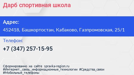 Дарб, спортивная школа по адресу 452418, Башкортостан, Кабаково, Газпромовская, 25/1 в дальнейшем Организация, размещена в следующих категориях: