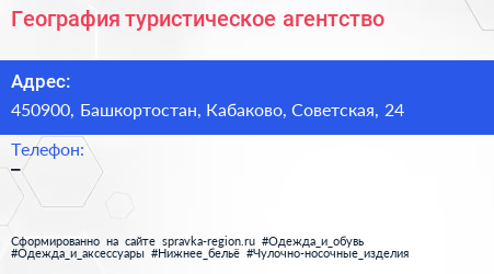 География, туристическое агентство по адресу 450900, Башкортостан, Кабаково, Советская, 24 в дальнейшем Организация, размещена в следующих категориях: