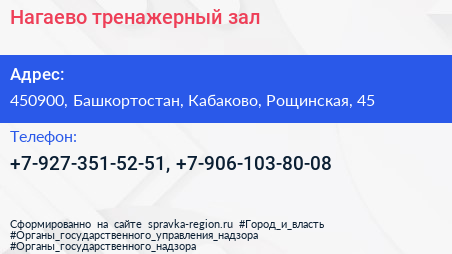 Нагаево, тренажерный зал по адресу 450900, Башкортостан, Кабаково, Рощинская, 45 в дальнейшем Организация, размещена в следующих категориях: