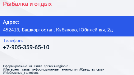 Рыбалка и отдых по адресу 452418, Башкортостан, Кабаково, Юбилейная, 2д в дальнейшем Организация, размещена в следующих категориях: