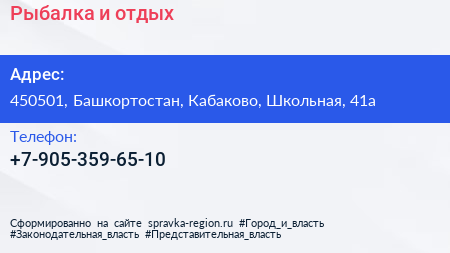 Рыбалка и отдых по адресу 450501, Башкортостан, Кабаково, Школьная, 41а в дальнейшем Организация, размещена в следующих категориях: