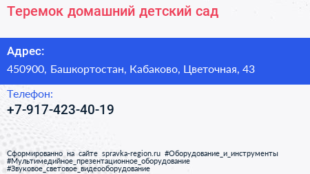 Теремок, домашний детский сад по адресу 450900, Башкортостан, Кабаково, Цветочная, 43 в дальнейшем Организация, размещена в следующих категориях: