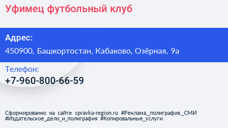 Уфимец, футбольный клуб по адресу 450900, Башкортостан, Кабаково, Озёрная, 9а в дальнейшем Организация, размещена в следующих категориях: