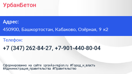 УрбанБетон по адресу 450900, Башкортостан, Кабаково, Озёрная, 9 к2 в дальнейшем Организация, размещена в следующих категориях: