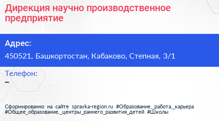Дирекция, научно-производственное предприятие по адресу 450521, Башкортостан, Кабаково, Степная, 3/1 в дальнейшем Организация, размещена в следующих категориях: