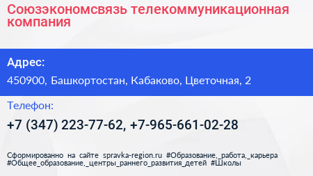 Союзэкономсвязь, телекоммуникационная компания по адресу 450900, Башкортостан, Кабаково, Цветочная, 2 в дальнейшем Организация, размещена в следующих категориях: