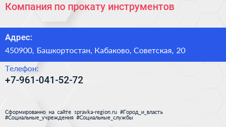 Компания по прокату инструментов по адресу 450900, Башкортостан, Кабаково, Советская, 20 в дальнейшем Организация, размещена в следующих категориях: