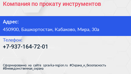 Компания по прокату инструментов по адресу 450900, Башкортостан, Кабаково, Мира, 30а в дальнейшем Организация, размещена в следующих категориях: