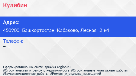 Кулибин по адресу 450900, Башкортостан, Кабаково, Лесная, 2 к4 в дальнейшем Организация, размещена в следующих категориях: