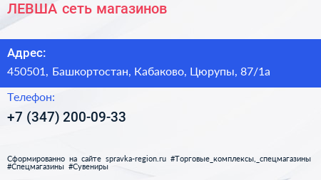 ЛЕВША, сеть магазинов по адресу 450501, Башкортостан, Кабаково, Цюрупы, 87/1а в дальнейшем Организация, размещена в следующих категориях: