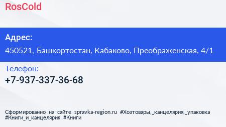 RosCold по адресу 450521, Башкортостан, Кабаково, Преображенская, 4/1 в дальнейшем Организация, размещена в следующих категориях: