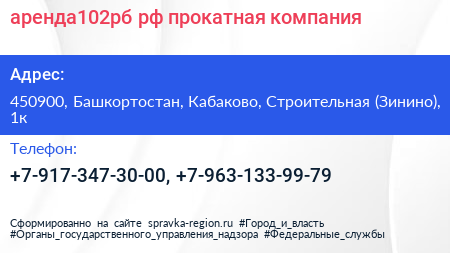 аренда102рб.рф, прокатная компания по адресу 450900, Башкортостан, Кабаково, Строительная (Зинино), 1к в дальнейшем Организация, размещена в следующих категориях: