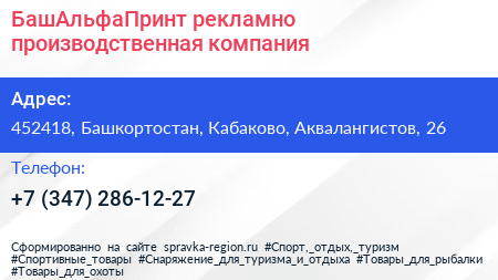 БашАльфаПринт, рекламно-производственная компания по адресу 452418, Башкортостан, Кабаково, Аквалангистов, 26 в дальнейшем Организация, размещена в следующих категориях: