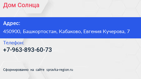 Дом Солнца по адресу 450900, Башкортостан, Кабаково, Евгения Кучерова, 7 в дальнейшем Организация, размещена в следующих категориях: