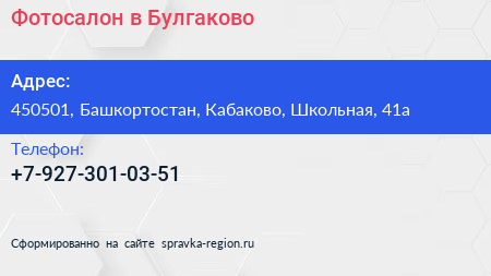 Фотосалон в Булгаково по адресу 450501, Башкортостан, Кабаково, Школьная, 41а в дальнейшем Организация, размещена в следующих категориях: