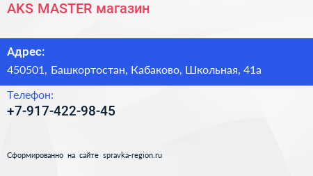 AKS-MASTER, магазин по адресу 450501, Башкортостан, Кабаково, Школьная, 41а в дальнейшем Организация, размещена в следующих категориях: