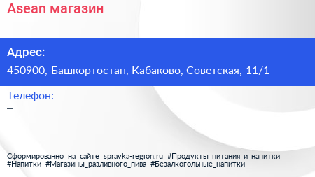 Asean, магазин по адресу 450900, Башкортостан, Кабаково, Советская, 11/1 в дальнейшем Организация, размещена в следующих категориях:
