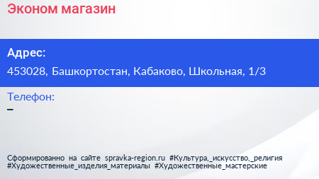 Эконом, магазин по адресу 453028, Башкортостан, Кабаково, Школьная, 1/3 в дальнейшем Организация, размещена в следующих категориях: