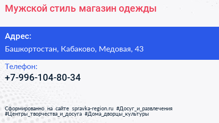 Мужской стиль, магазин одежды по адресу Башкортостан, Кабаково, Медовая, 43 в дальнейшем Организация, размещена в следующих категориях: