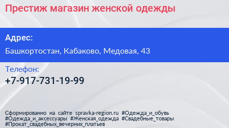 Престиж, магазин женской одежды по адресу Башкортостан, Кабаково, Медовая, 43 в дальнейшем Организация, размещена в следующих категориях: