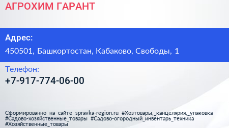 АГРОХИМ-ГАРАНТ по адресу 450501, Башкортостан, Кабаково, Свободы, 1 в дальнейшем Организация, размещена в следующих категориях:
