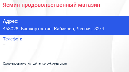 Ясмин, продовольственный магазин по адресу 453028, Башкортостан, Кабаково, Лесная, 32/4 в дальнейшем Организация, размещена в следующих категориях: