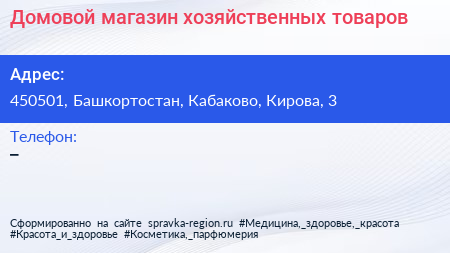 Домовой, магазин хозяйственных товаров по адресу 450501, Башкортостан, Кабаково, Кирова, 3 в дальнейшем Организация, размещена в следующих категориях: